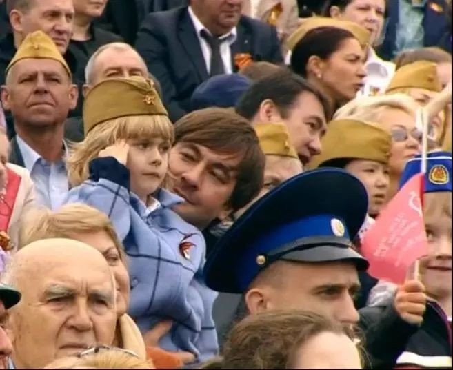 而且,俄罗斯的爱国主义教育是从娃娃抓起的。在今年的阅兵现场,媒体的镜头记录了这样的场景——观众席上老兵举起颤抖的手敬礼,身边的孩子也学着爷爷的样子举起右手。