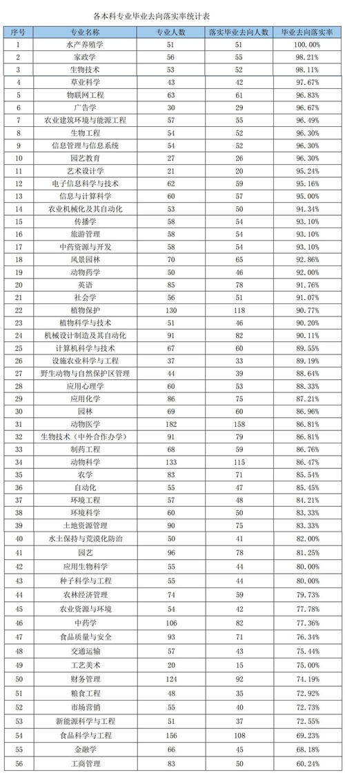 报告显示,截至2021 年 8 月 31 日,吉林农业大学2021届毕业生落实毕业去向人数为 3257 人,初次毕业去向落实率为85.35%,其中协议和合同就业率为 22.41%,升学率为 30.19%。从专业就业情况看,有24 个专业的毕业去向落实率超过 90%,其中水产养殖学专业的毕业去向落实率为 100%。具体情况,可以参考下面这张图片。