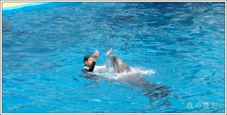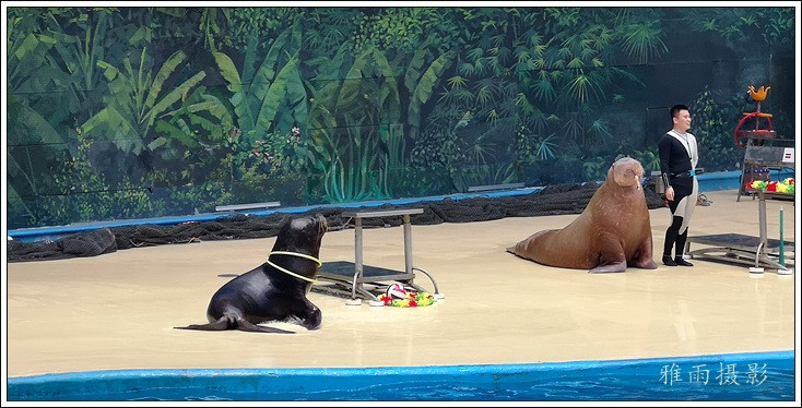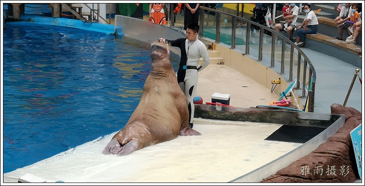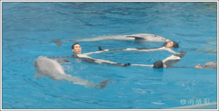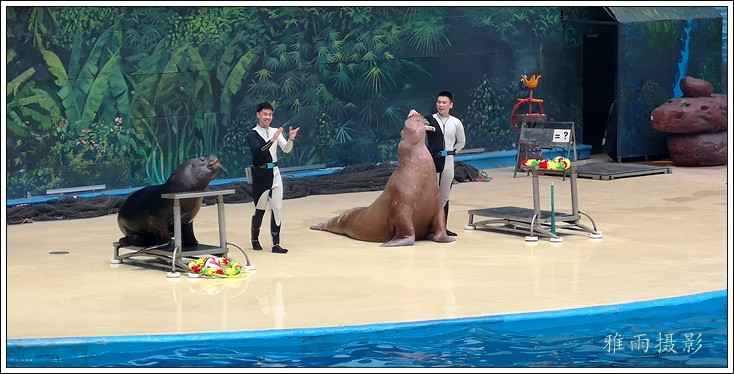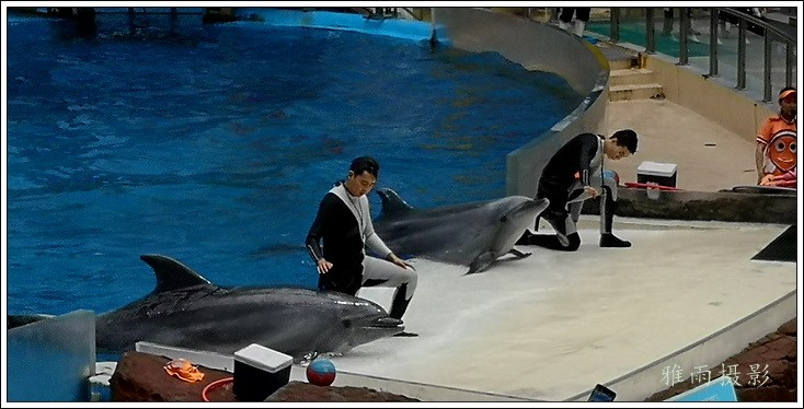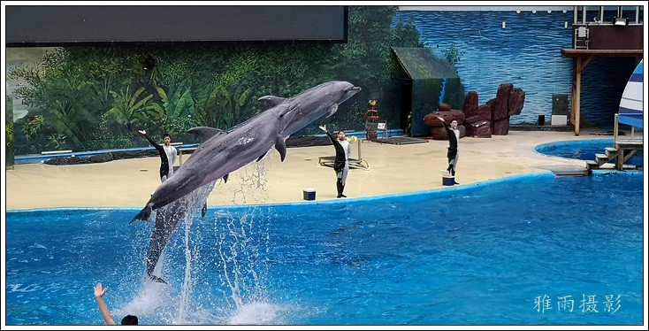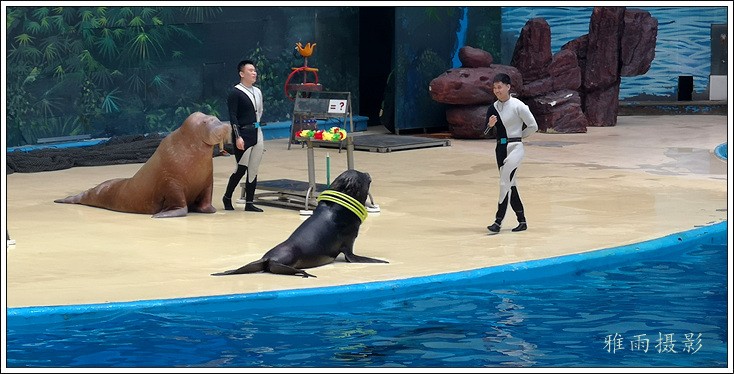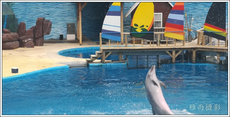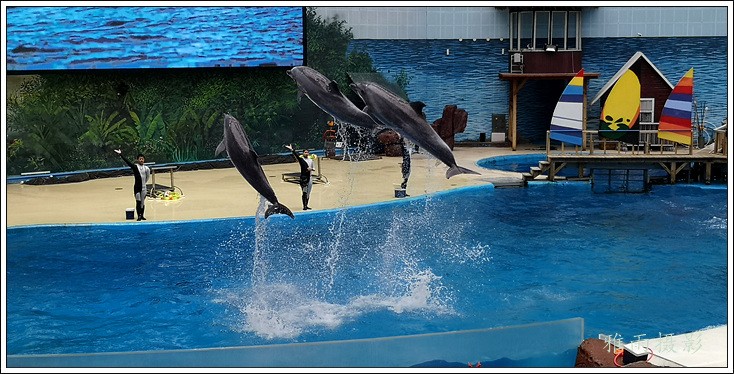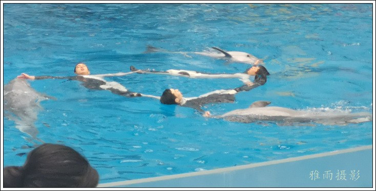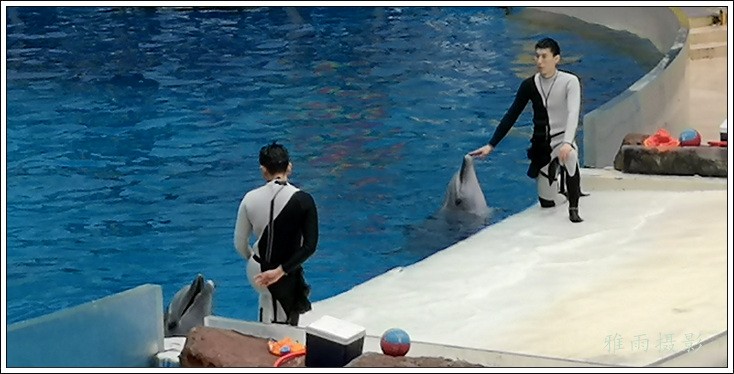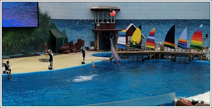 表演场有1个大型表演池,3个寄养池,200个座位,可同时300余人观看表演。游客们不仅可以近距离观微大白鲸、海豚、海狮等海洋动物的精彩表演,还可以在表演台上与海豚RK玩转呼啦圈,与海豚握手、亲吻,和它们等距离接触。