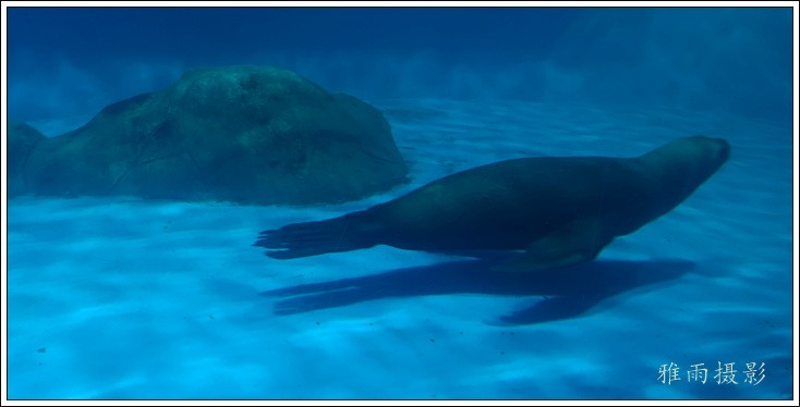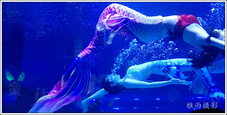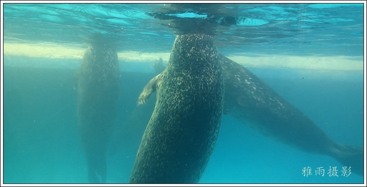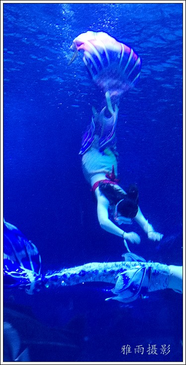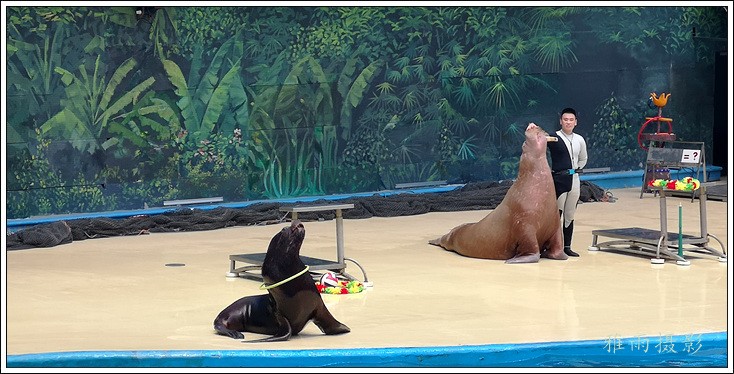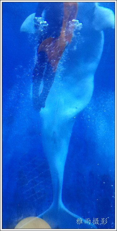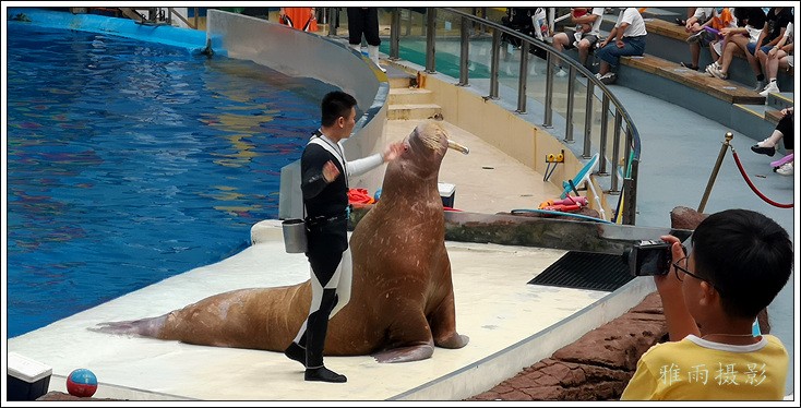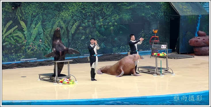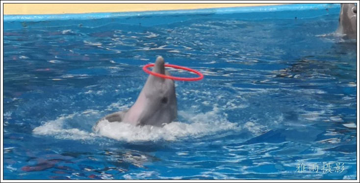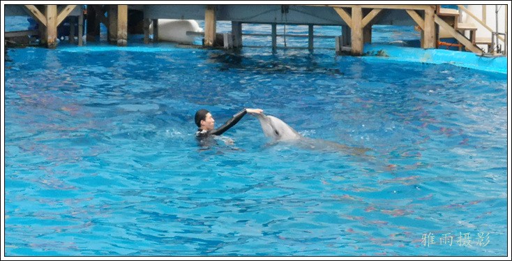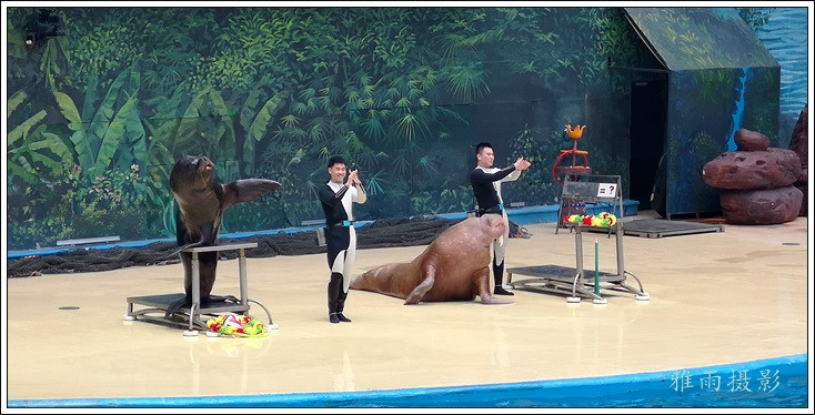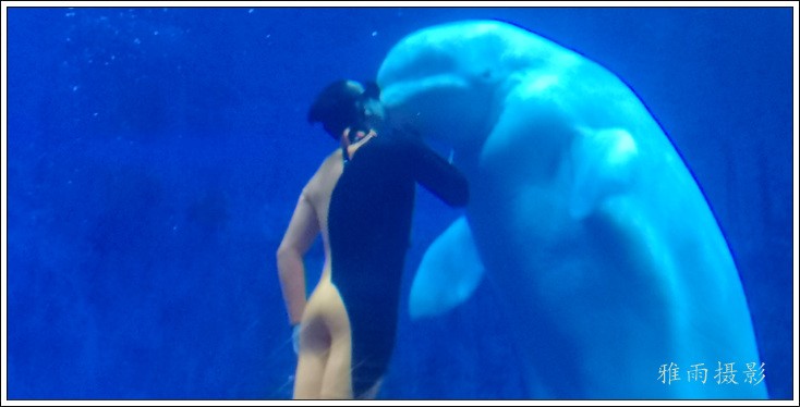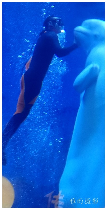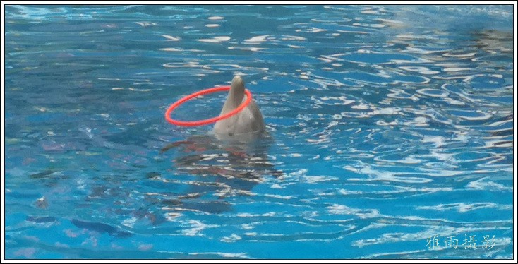 表演场有1个大型表演池,3个寄养池,200个座位,可同时300余人观看表演。游客们不仅可以近距离观微大白鲸、海豚、海狮等海洋动物的精彩表演,还可以在表演台上与海豚RK玩转呼啦圈,与海豚握手、亲吻,和它们等距离接触。