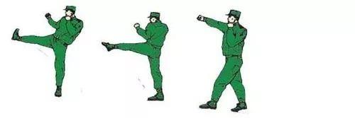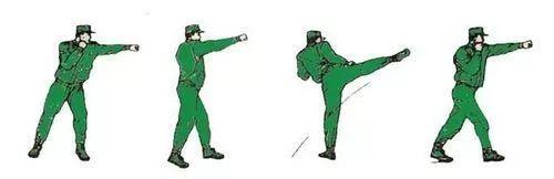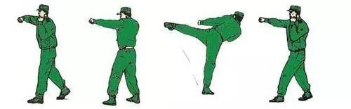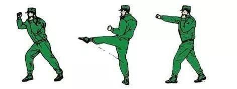 动作要领:右前蹬,接左腿弹踢,左脚落步,出右直拳(不收回),目视前方。如下图: 要求:前蹬猛,弹踢快,重心稳。