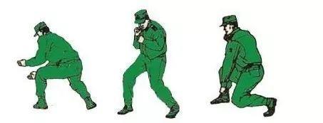 动作要领:进步的同时,身体下潜,两腿弯曲,两手变掌下插,左手在上(与膝同高),右手在下(与小腿同高),掌心相对;身体向右后转体270度的同时右脚上步,两掌变拳上提后拉于胸前,上体前俯,随即左膝下跪,左拳下击与左膝同高,右拳置于下颌,两眼目视下方。如下图: 要求:上步抱腿快,转摔猛。