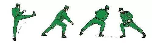 动作要领:进步同时,左手向外挡抓,掌心向外,右脚向左前上步,右手前伸上挑,掌心向上,置于左手前,随即左脚向右脚后背步,两腿弯曲;上体迅速向左后转体弯腰,两手猛力下拉,同时两腿蹬直(两脚左右相距约一脚之长),臀部上顶,两手变拳置于身体左侧;身体左转,右脚下踹,左拳置于下颌,右拳置于大腿外侧,两眼目视前下方。如下图: 要求:转体、弯腰、下拉、蹬腿迅速连贯。