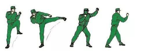 动作要领:右掌变拳置于下颌,同时右脚向前垫步,起左腿侧踹,接右横踢,右脚落步,出左直拳(不收回),两眼目视前方;左后转身180度成格斗式,目视前方。如下图: 要求:侧踹快,横踢猛。