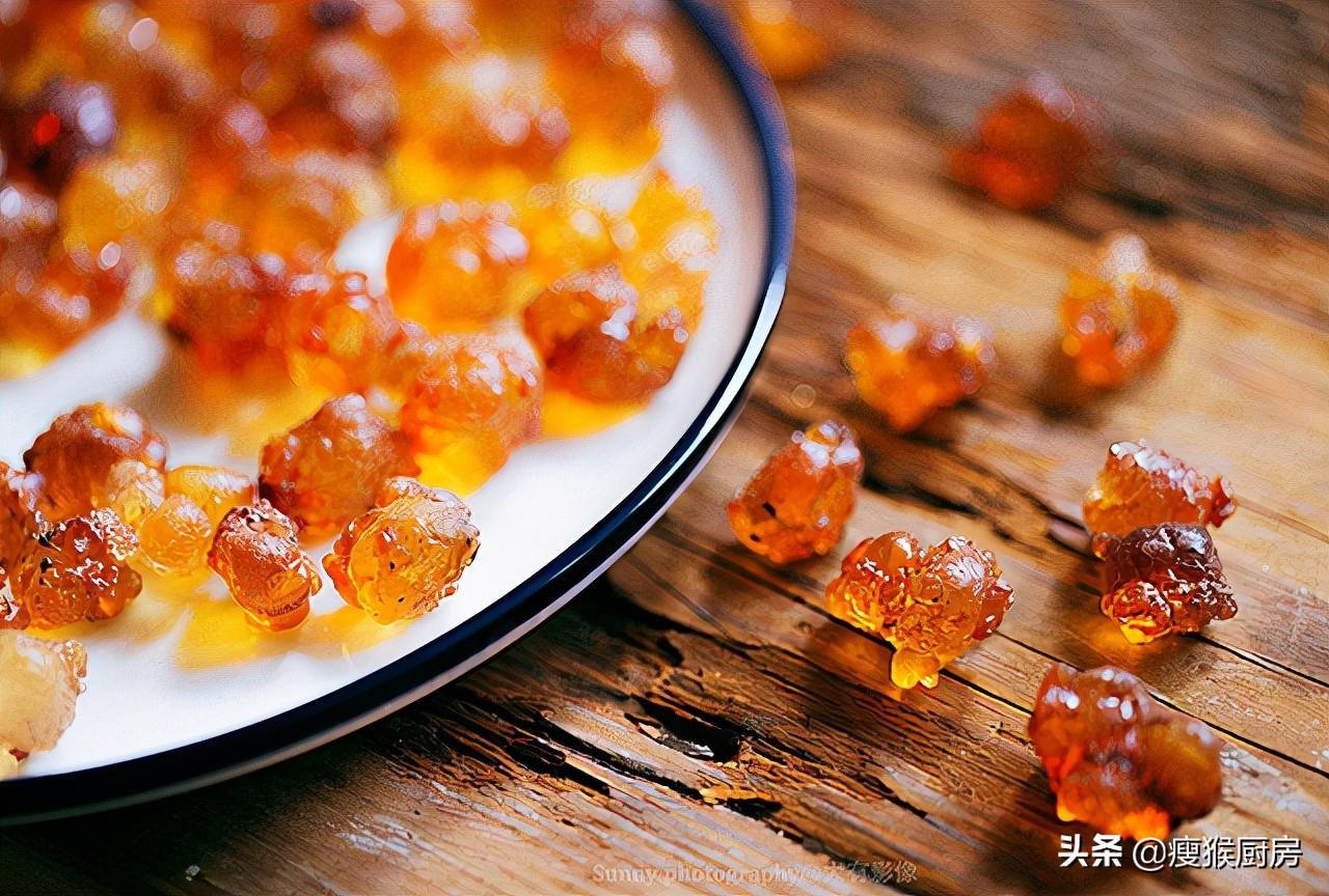 桃胶是桃树的树皮分泌出来的红褐色或者黄褐色的胶状体。桃胶可以和银耳一起煮羹、也可以在煮汤圆的时候放点桃胶,都是很好的吃法。