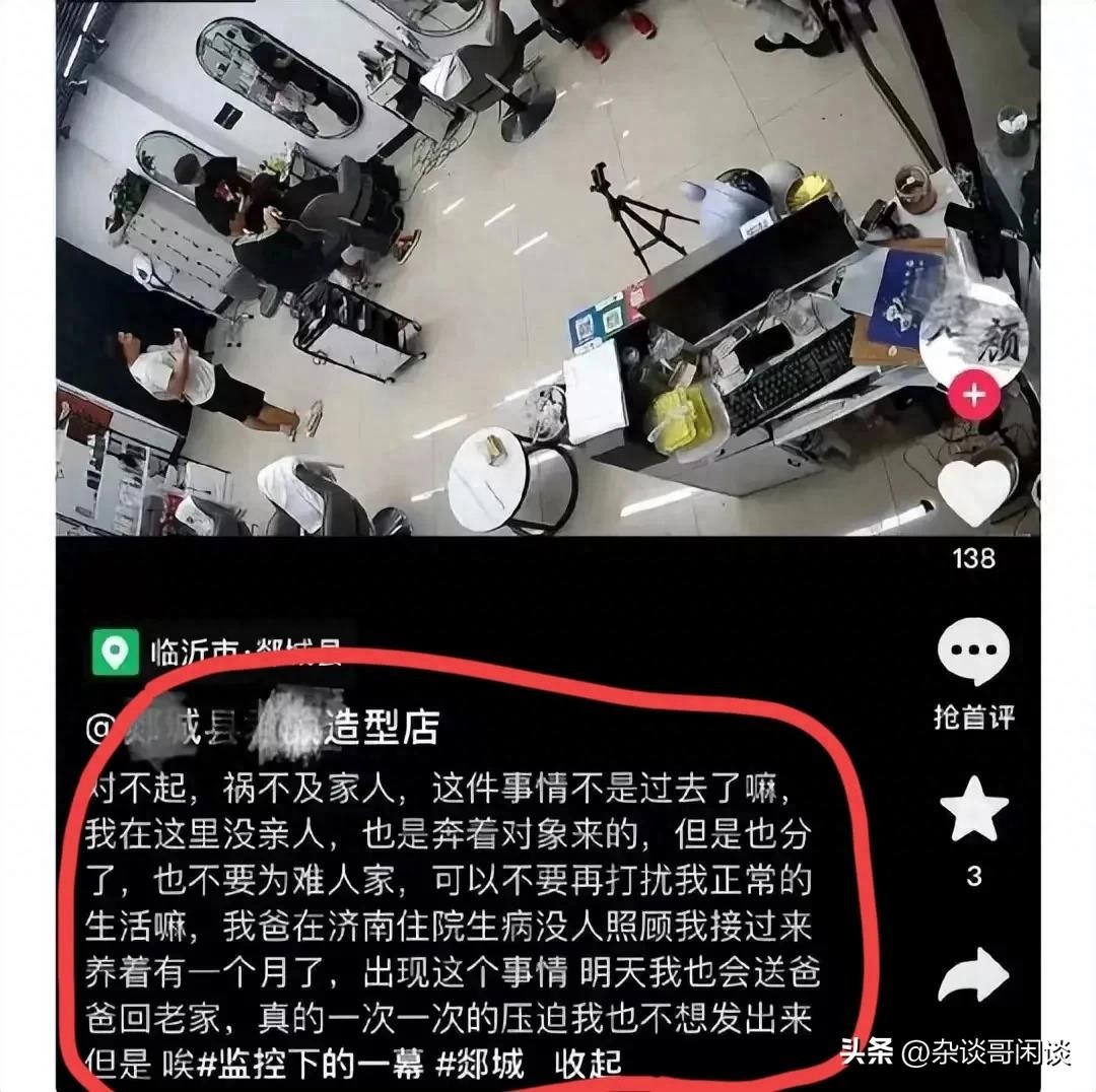 临沂理发店事件有了新的进展。最初,当女公务员道歉后,大家以为这个事件已经解决,可以画上句号。然而,近日,这家理发店老板深夜发布了一篇发文,表达了他的无奈之情,他写道:“对不起,祸不及家人,这事不应该早已结束吗?我在这里没有亲人,也是来这里工作的,但已分手了。请不要再打扰我正常的生活,可以吗?我父亲住院在济南,生病没有人照顾,我接他回老家一个月了。这事真的让人感到一次又一次的压迫。我也不想发这篇文章,但唉。”