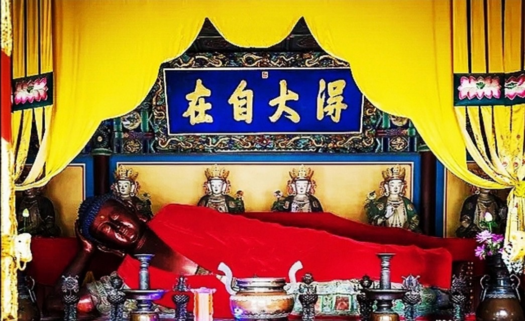 ▲元代建造的位于西山卧佛寺内的铜卧佛像。