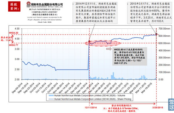 补充一句,私有化套利不仅仅在美国可行,在欧洲、香港、日本市场同样有相同的机会。由此还可衍生出逻辑相同的并购套利策略。下面给大家看一个香港市场的套利机会: