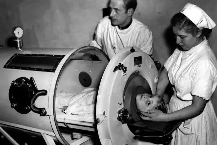 用于治疗小儿麻痹症的铁肺呼吸机。