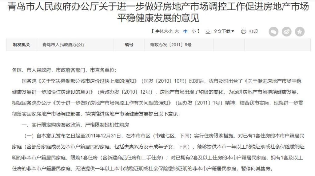 回顾青岛楼市限购之路,始于11年前的2011年1月31日,原青岛市国土资源和房屋管理局发布的《关于落实住房限购政策有关事项的通知》,对已有1套住房的本市户籍居民家庭、能够提供本市一年以上纳税证明或社会保险缴纳证明的非本市户籍居民家庭,限购1套住房;对已拥有2套及以上住房的本市户籍居民家庭、拥有1套及以上住房的非本市户籍居民家庭、无法提供一年以上本市纳税证明或社会保险缴纳证明的非本市户籍居民家庭,暂停向其售房。