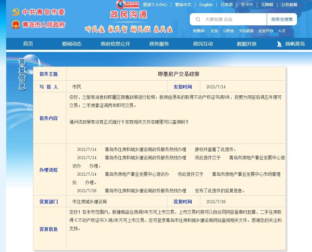 7月18日,青岛市住房和城乡建设局在回复市民提问时表示: