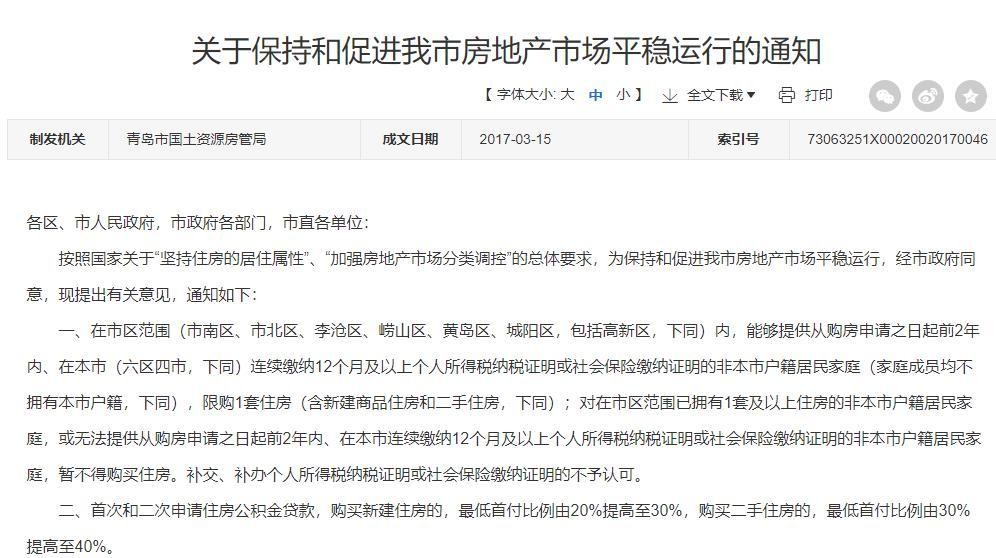2017年3月15日,青岛市首次发布《关于保持和促进我市房地产市场平稳运行的通知》,打响了限购第一枪,限购范围包括市南区、市北区、李沧区、崂山区、黄岛区、城阳区,包括高新区。半个月后,青岛进一步发布通知,明确了“认房又认贷”的贷款政策和满两年后才可上市交易的限售政策。2017年4月7日,青岛市又对3月份楼市新政进行了解读,明确了不同类型住房上市交易年限的问题。