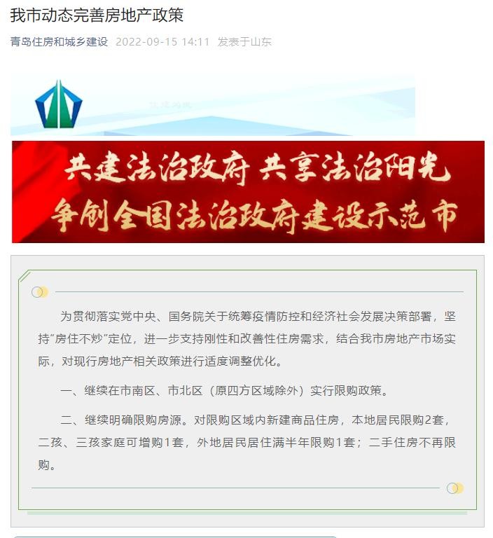9月15日,青岛市住房和城乡建设局官微发布消息:为贯彻落实党中央、国务院关于统筹疫情防控和经济社会发展决策部署,坚持“房住不炒”定位,进一步支持刚性和改善性住房需求,结合我市房地产市场实际,对现行房地产相关政策进行适度调整优化。