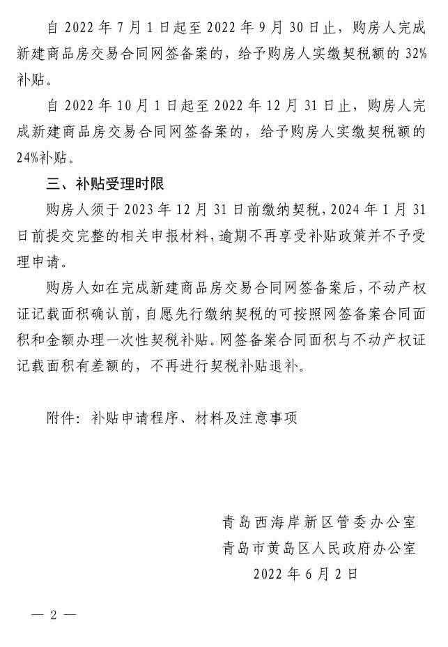 调整住房限购区域范围。住房限购区域由市南区、市北区、李沧区、崂山区、黄岛区、城阳区(含高新区)调整为市南区、市北区、李沧区、崂山区除王哥庄街道以外区域(以下简称“中心城区”),将黄岛区、城阳区(含高新区)、崂山区王哥庄街道调出限购区域。这一调整有利于中心城区需求外溢,缓解中心城区房价上涨压力,同时缓解非限购区域房价下行压力,保持和促进全市房价总体稳定。