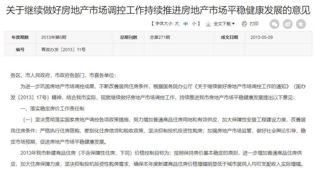 2013年3月,青岛市人民政府办公厅发布 《关于继续做好房地产市场调控工作持续推进房地产市场平稳健康发展的意见》,出台了五条房地产调控措施,确定了2013年度青岛市房价控制目标为:本年度新建商品住房价格增幅明显低于城市居民人均可支配收入实际增幅。