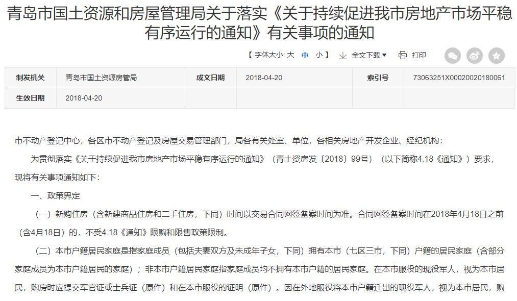一年后的2018年4月18日,青岛继续对相关楼市政策进行优化调整,贯彻落实“房子是用来住的,不是用来炒的”定位,在本市范围内新购买的新建商品住房和二手住房,需取得《不动产权证书》满5年后方可上市交易。两天后,青岛市即对楼市“418新政”进行了细则解读,从政策界定、购房资格等方面进行了详细阐释。