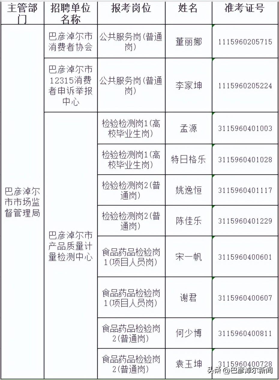 根据《2025年巴彦淖尔市事业单位公开招聘工作人员公告》要求,经报名、资格初审、笔试、资格复审、面试、体检和考察等程序,巴彦淖尔市市场监督管理局所属事业单位确定10名拟聘用人员,现公示如下:
