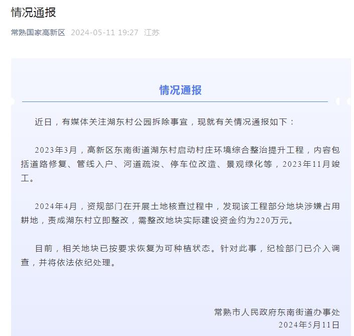 5 月 11 日,据江苏卫视报道,苏州常熟市东南街道湖东村村民反映,当地投资近 1700 万元打造的公园,建成使用不到 5 个月就被拆掉了。此事究竟是什么原因?11 日傍晚当地通报,此事纪检部门已介入调查,并将依法依纪处理。