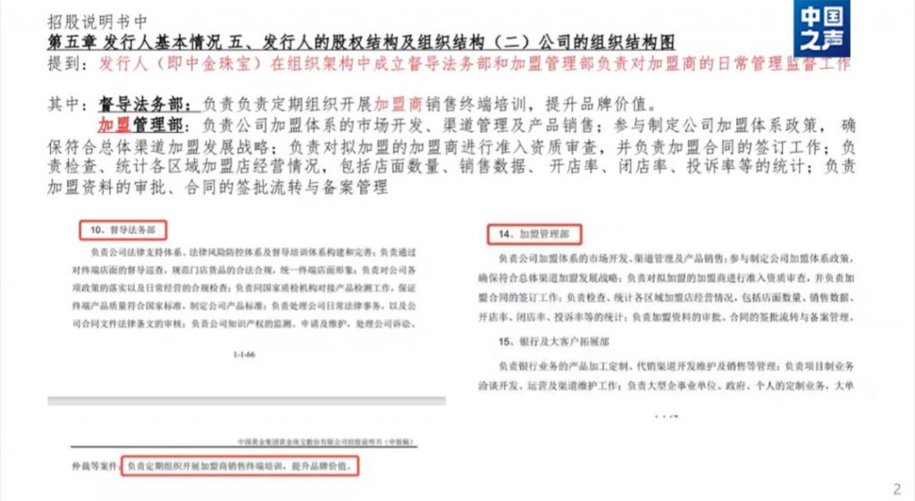 △记者拿到的一份中金珠宝招股说明书,摘要中提到成立督导法务部和加盟管理部对加盟商进行督导巡查。