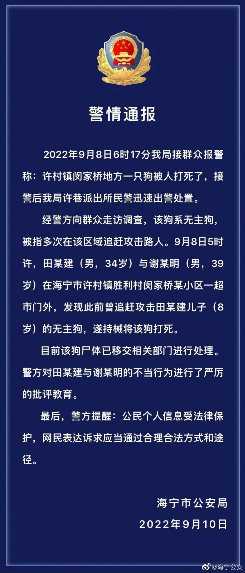 9 月 10 日,嘉兴海宁警方通报此事称,该狗系无主狗,被指多次在该区域追赶攻击路人。男子发现此前该狗曾追赶攻击自己儿子,遂持械将该狗打死。目前该狗尸体已移交相关部门进行处理。警方对男子的不当行为进行了严厉的批评教育。