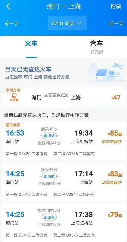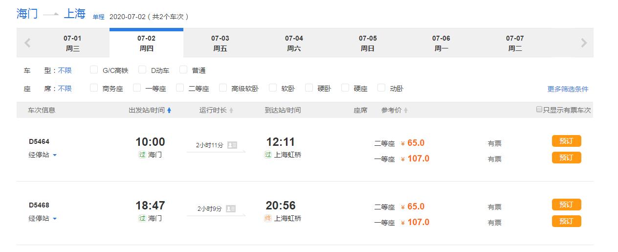 小编上携程网仔细查看了海门直达上海动车的班次情况。