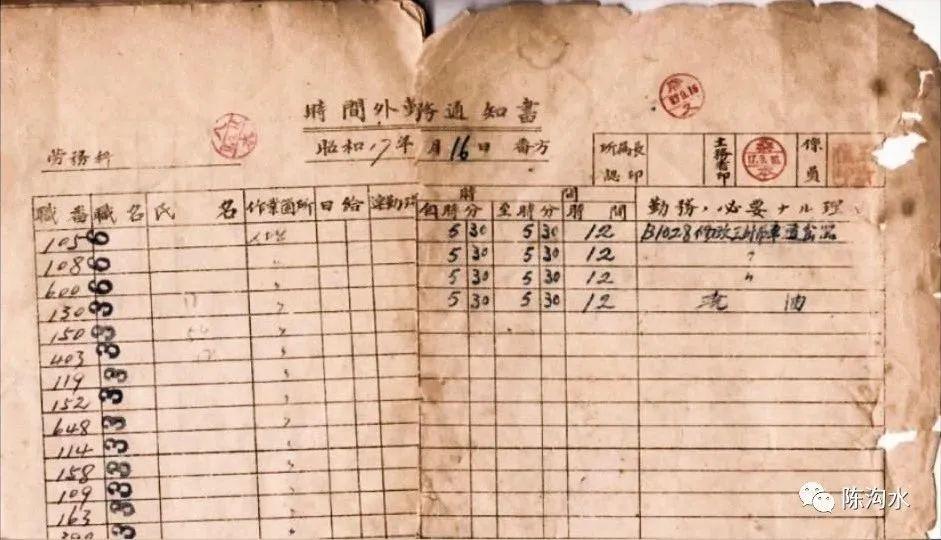 十三势软手、手头,写在日寇昭和17年(1942)时间外勤务通知书上