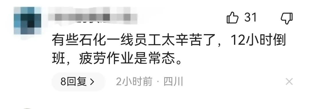 有的网友也表示,石化厂一线员工太辛苦了,12小时倒班,疲惫作业是常态。