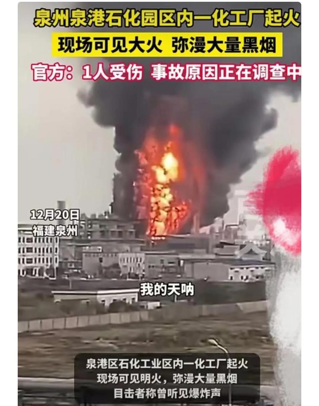 就在前几天12月20日,福建泉州泉巷石化园区一化工厂也发生了一场火灾,有一人受伤,损失也是不可估量。