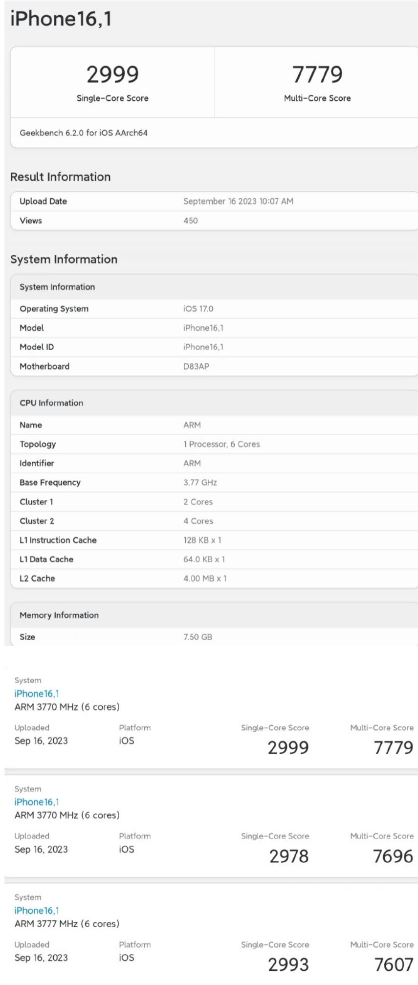 IT 之家此前报道,iPhone 15 Pro 和 iPhone 15 Pro Max 在 Geekbench 的最新跑分出炉, A17 Pro 处理器主频为 3770MHz-3777MHz 不等,实现单核 2999、多核 7779 的成绩。@数码闲聊站 表示,这样算下来,相当于单核提升了 13.5%左右,多核提升了 11%左右。