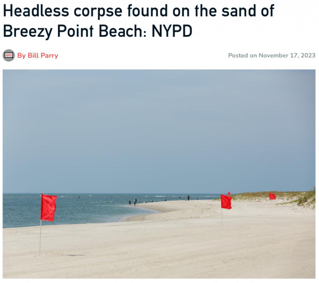 据纽约华人资讯网综合纽约邮报、Amny 报道 在纽约市皇后区微风角海滩(Breezy Point Beach)发现了一具被肢解的尸体,手臂和头部都被切除了,只剩躯干,警方认为这可能是一位艾美奖获奖电影制片人的尸体。