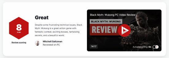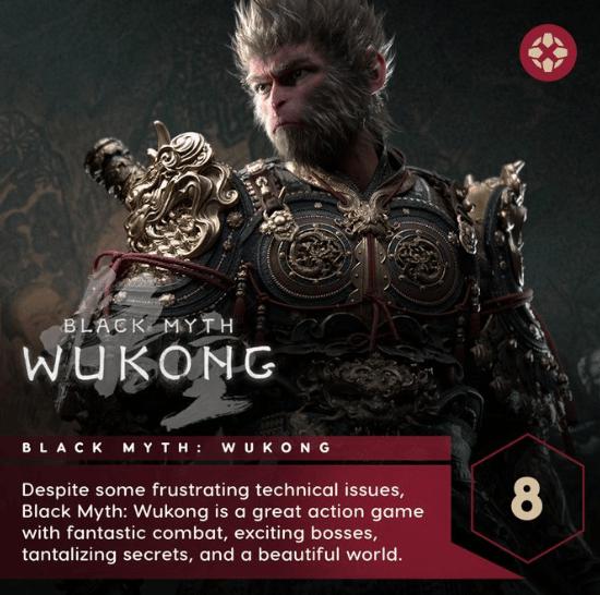 具体来说,在《黑神话:悟空》的打分上,IGN 只为本作打出了 8 分的成绩,缺点是存在一些令人沮丧的技术、本地化问题。