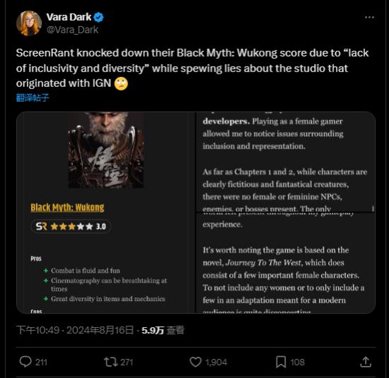 此外,screenrant 等国外媒体也都疯狂给《黑神话:悟空》刷差评,认为游戏本身存在很大问题,比如游戏背景《西游记》中实打实的包含了一些重要的女性角色。但在针对现代受众的改编中,没有包含任何女性角色或只包含少数女性角色,这令人相当不安。