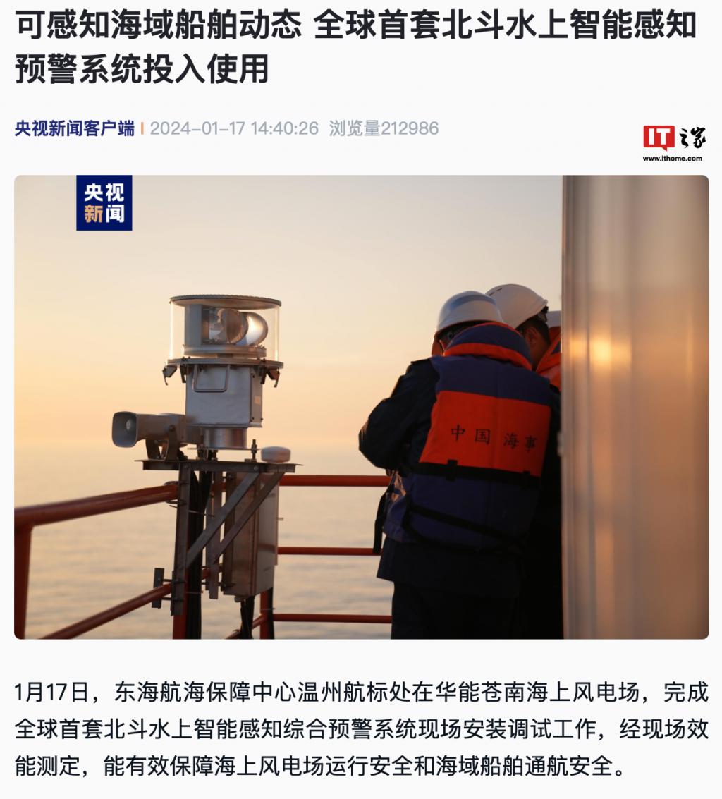 IT 之家 1 月 17 日消息,据央视新闻消息," 东海航海保障中心温州航标处 " 今天在华能苍南海上风电场完成了全球首套 " 北斗水上智能感知综合预警系统 " 现场安装调试工作。