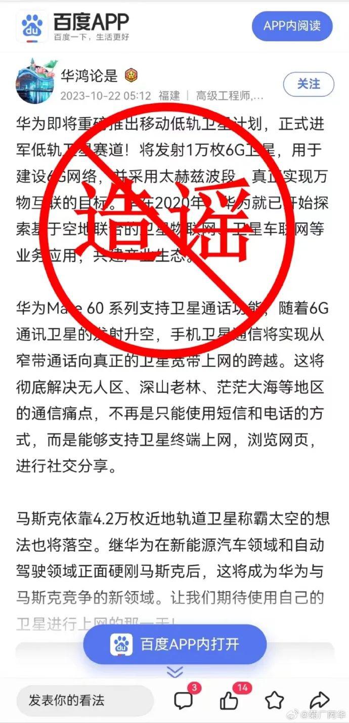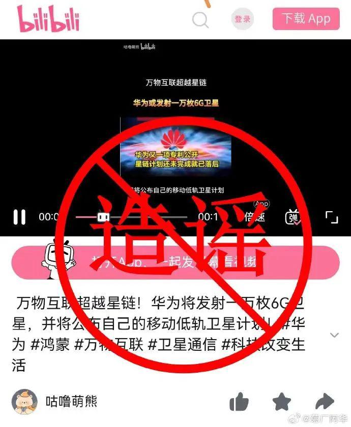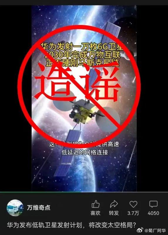 网传 " 华为将发射 1 万枚 6G 移动低轨卫星 " 纯属造谣,造谣者毫无根据,无事生非,在多个平台、账号推送相同信息扩散,请勿信勿传,果断举报。