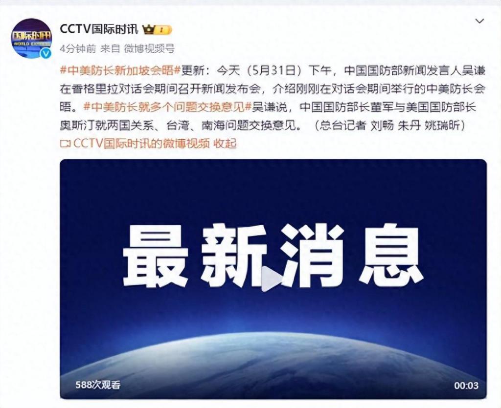今天(5 月 31 日)下午,中国国防部新闻发言人吴谦在香格里拉对话会期间召开新闻发布会,介绍刚刚在对话会期间举行的中美防长会晤。吴谦说,中国国防部长董军与美国国防部长奥斯汀就两国关系、台湾、南海问题交换意见。