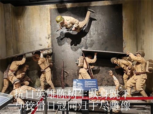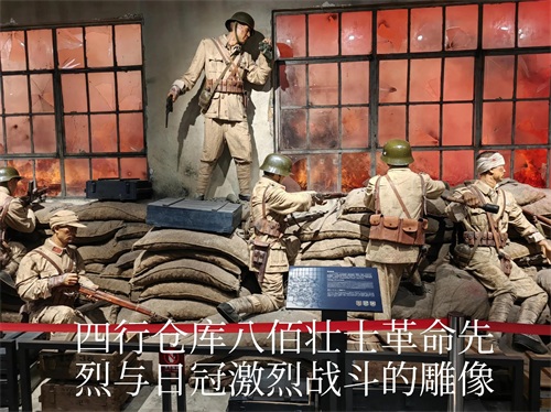 虽然历史已经是离我们而去,但是我们永远忘不了为国家民族而战的先烈们。当我在展厅看到了我们的先烈陈树生民族英雄抱着手榴弹跳下仓库与日军同归于尽的雕塑,使我的心灵受到了强大的震撼。这就是我们中华民族的精神所在,这就是我们中华民族的脊梁,让我们中华民族得以传承。在国破家亡的时候,我们的革命先烈们为了中华民族的尊严和领土完整,视死如归挽回了我们中华民族不会亡的尊严,特别是谢晋元将军带领全营四百人的英雄将士们(对外称八百壮士)明知四行仓库是他们的坟墓,但是他们仍然是抱着以死报国的民族之魂,与侵华日寇血战到底的决心,正所谓他们的誓死捍卫,才使我们的中华民族在最危险的时候不会亡,才使我们中华民族赢得了伟大的抗日战争胜利。正因为革命先烈们用无数生命鲜血,使我们中华民族屹立于世界民族之林。