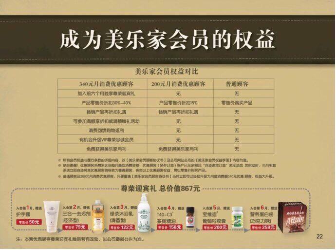 所以广告和代理费用就占40%~60%,所以美乐家采用目前领先的CDM直钩系统,全球目前5家,例如星巴克、亚马逊等,就是工厂到顾客,取消中间任何代理等中间商环节和广告费用,将这部分费用用来研发高品质产品,产品成本提高到20%~25%,(例如洁厕专家里面还有20个柠檬),降低售价,还有一部分用来直接给到优惠顾客直接购买优惠,才会30~40%的折扣。美乐家也并不是非要你买340,而是由你自己选择,美乐家会员有三种,(1)普通的,随意消费,购物不打折,这档人很少(2)月购200元,购物85折,这档人也很少(3)月购340,购物6~7折,然后会有1000多元赠品,每月5%~10%的积分(一个积分一元钱),这档人最多。还有产品试用30天内不满意退!退!退!没有任何风险。