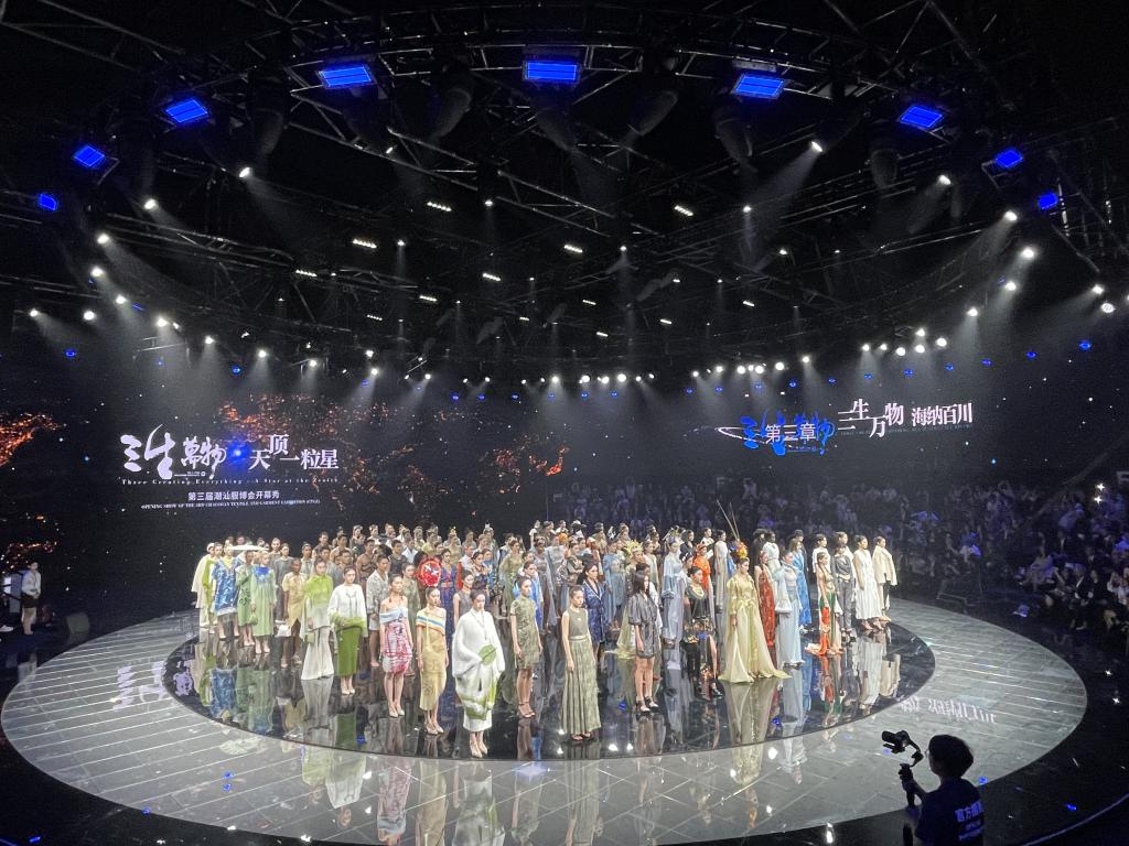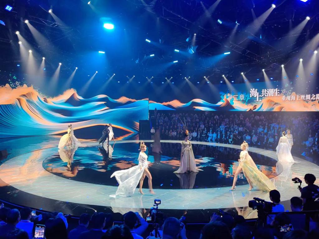 作为时尚与潮流交汇的产业盛会,第三届潮汕服博会最受瞩目的活动之一当属《潮起东方 3.0》开幕秀。羊城晚报全媒体记者在开幕秀现场看到," 秀场 " 以 " 无界 " 为主题,在行业内开创性采用 3000 平方米超大圆形秀场,可容纳观众近千人,打造出震撼的 " 声光电 " 沉浸式体验,以独特的视角和创新的手法,将不同国度、调性、风格和品类的多个品牌编写成海上丝绸之路的故事,通过 100 多位国内外超模的走秀演绎,全品类展示内衣、家居服、毛衫、时装等多种纺织服装的魅力、多方位呈现独一无二的设计,给观众带来绝美视觉享受的同时也揭晓了行业流行新方向。