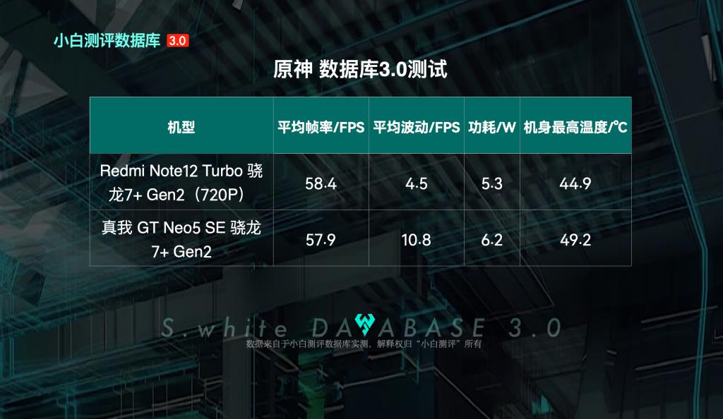 《原神》数据库 3.0 模型测试,Redmi Note12 Turbo 平均帧率 58.4 FPS,功耗 5.3 W,机身最高温度 44.9 ℃,表现非常不错。