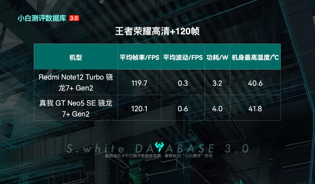 这次骁龙 7+ Gen2 表现确实非常给力,已发布的两台机型 Redmi Note12 Turbo 和真我 GT Neo5 SE,实测王者荣耀高清 120 都能跑满,红米功耗 3.2W,比真我低了 0.8W;