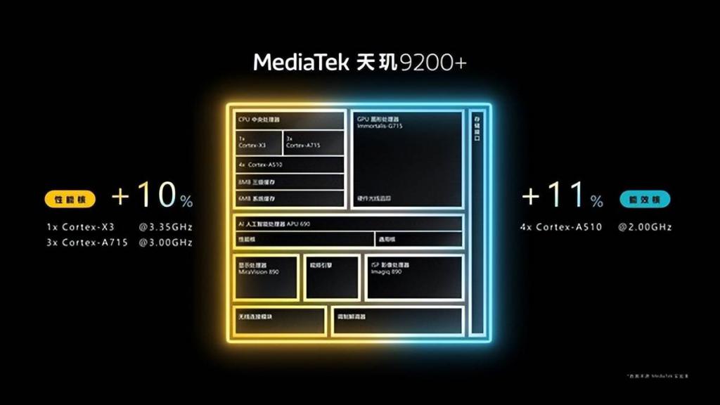CPU 部分由 1 颗 X3 超大核、3 颗 A715 大核和 4 颗 A510 能效核组成,CPU 主频分别是 3.35GHz、3.0GHz 和 2.0GHz。对比上一代,天玑 9200+ 性能核心提升了 10%,能效核心提升了 11%!抖动率低 60%,平均帧率高 10%,最低帧数高了 85%。跑分突破 136 万