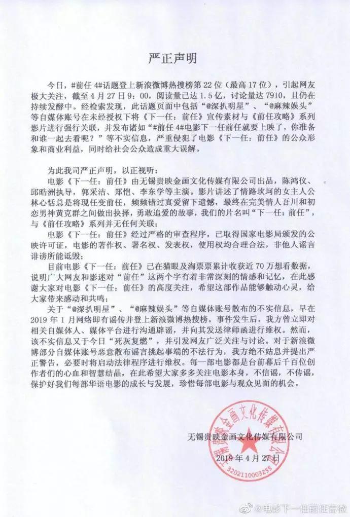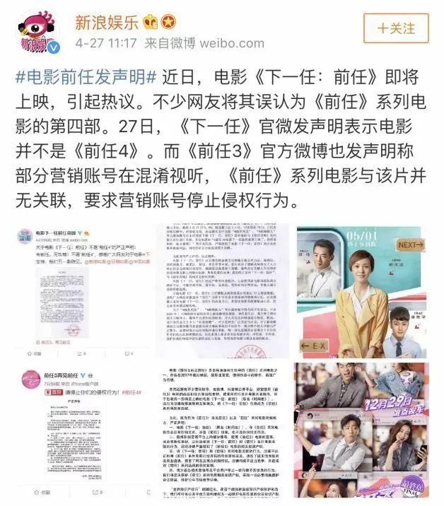 “前任4”话题在营销号带节奏下冲上微博热搜,都在误导吃瓜群众《下一任:前任》就是《前任4》,迫使正牌《前任》系列官博不得不出来辟谣。