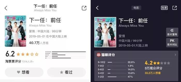 影片也确实凭借蹭《前任》系列这一国产爱情喜剧金牌IP,收获了不小的关注度,猫眼想看人数超过了32万,要知道即将上映的好莱坞大片《大侦探皮卡丘》也只有不足20万想看。
