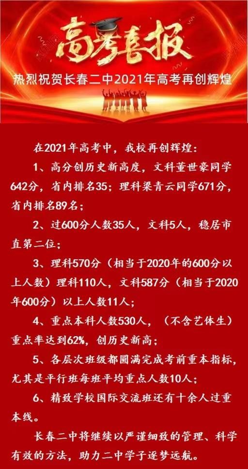 紧紧围绕立德树人根本任务和21世纪学生核心素养要求,实施分层次差异化教学,显著提升课堂教学质量,实现不同层次学生最优化发展。出台《长春二中全面推进高考改革630方案》,积极应对新一轮高考改革。先后有百余名学生考入北大、清华、科大、人大、复旦等著名高校。近几年来,600分以上高分段进线率15%左右,重点本科进线率55%左右,一般本科录取率保持100%,学生进出口增值率始终位于春城名校前列。2025年,高考成绩再次实现新突破,600分以上高分段人数35人,重点本科进线人数530人。文、理科最高分创历史新高,文科642分,理科671分;进线人数和进线率创历史新高,重点本科进线率62%;高分段人数再创历史新高,达到121人。