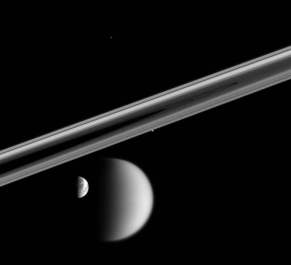 图解:这幅由卡西尼-惠更斯号拍摄的照片中可以看到4颗卫星:最大的土卫六、下方的土卫四、较小的土卫十六和最小的土卫十三