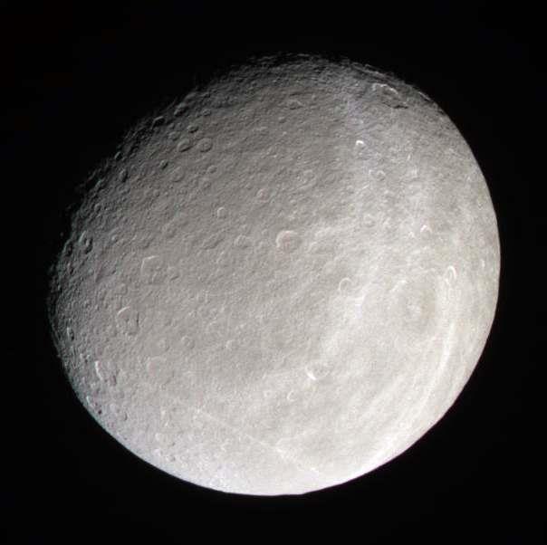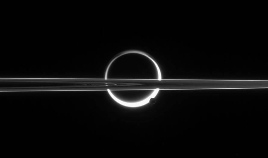 图解:新月时位于土星环之后的土卫六。右下小缺口为较小卫星土卫二。上方为北。