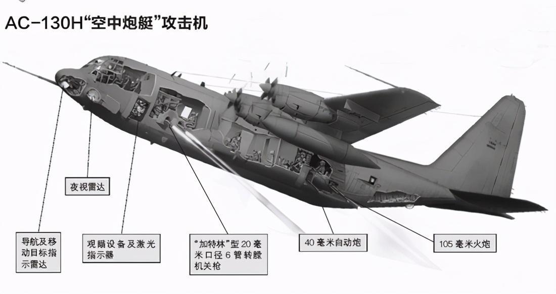 AC-130空中炮艇装有两门25mm口径的GAU12机炮;一门40mm"博福斯"式自动机炮和一门105mm榴弹炮。AC-130H的电子设备也很先进,它有自动告警装置、电子干扰设备、红外诱饵吊舱、空中加油装置等。机上装备的全球卫星定位系统能为飞机提供精确攻击位置,并且随时向其友军报告目标位置,同时,AC-130H上还安装了激光制导炸弹和两挺7.62mm机枪,对地火力可谓超强无敌。