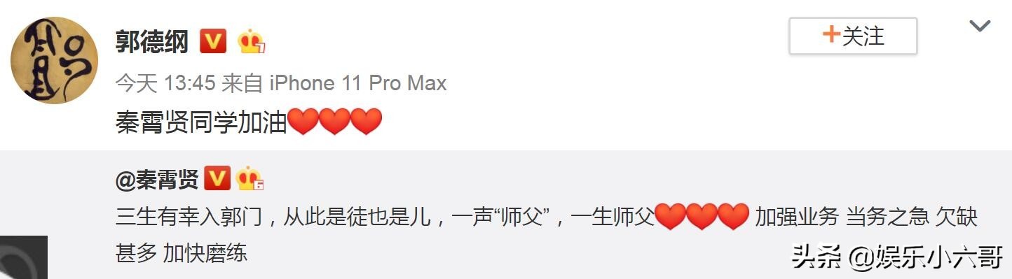 就在今天下午晚些时候,细心的网友发现郭德纲通过个人微博发布了一则消息,直接说道:秦霄贤同学加油!虽然仅仅六个字,但可以看出是对徒弟满满的期待。很多网友好奇的是为啥这都过去一周了,郭德纲怎么才反应过来给这位徒弟加油呢?其实根据分析不难看出,如今的郭德纲确实太忙了,能上微博的时间很有限,估计这也是百忙之中给徒弟加油,同时也是在“推广”自己的徒弟,毕竟我们都知道郭德纲粉丝可是有七千多万啊,这就相当于全国人民都知道了有一个相声演员叫秦霄贤。
