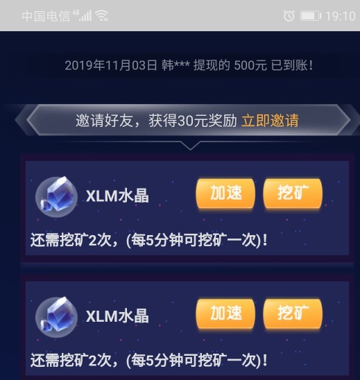 新用户会送一个矿机,点击挖矿即可,5分钟后收矿共收2次,获得1.26~30个币 = 1.26~30元!随机的e