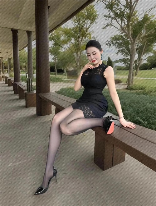 葱郁幽林间,长凳静卧。她身着黑色蕾丝裙,搭配丝袜与高跟鞋,似夜之精灵落于尘世。阳光穿透枝叶,洒下斑驳光影,与她的身影交织。
